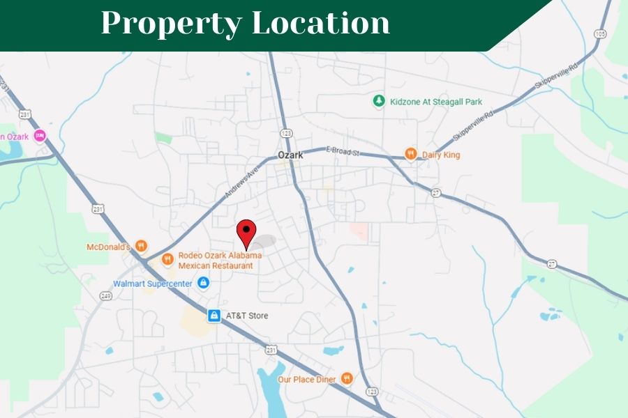 This property is conveniently located just minutes from downtown Ozark, where you’ll find grocery stores, restaurants, schools, medical centers, and everyday essentials. Dothan, one of the largest cities in the Wiregrass region, is a short drive away and offers major shopping centers, hospitals, entertainment options, and dining.