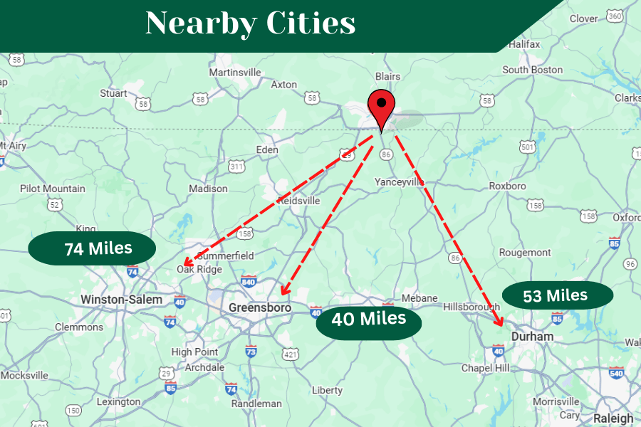 - Greensboro, NC – about 40 minutes away