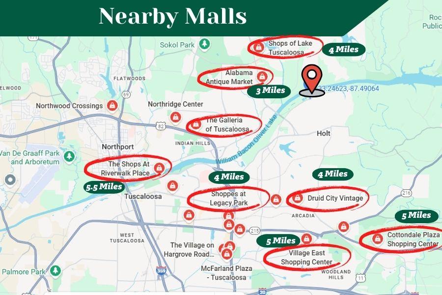 Shopping and entertainment are within reach as well, including University Mall — the largest retail destination in Western Alabama — as well as local boutiques, grocery stores, and service providers. Wikipedia