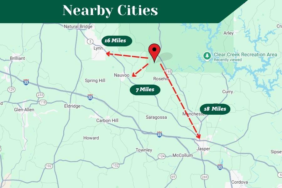 Jasper, AL – About 20–30 minutes away, offering major stores, grocery shopping, medical facilities, restaurants, schools, and entertainment options.